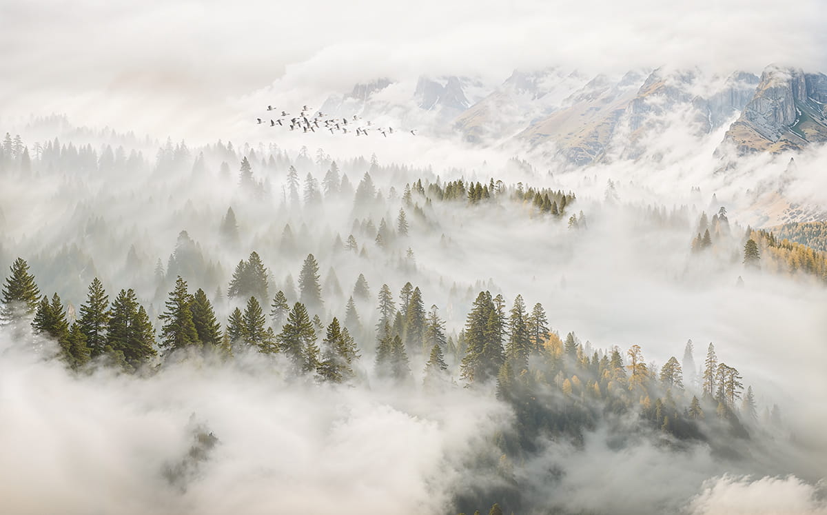 Фотошпалери Зграя над туманним лісом ( 25337 )Вартість залежить від розмірів