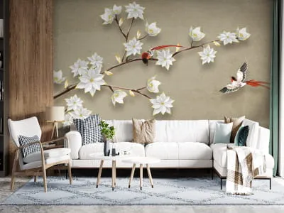 Фотообои Цветущая ветка и птицы 3Д ( 25093 )Стоимость зависит от размеров