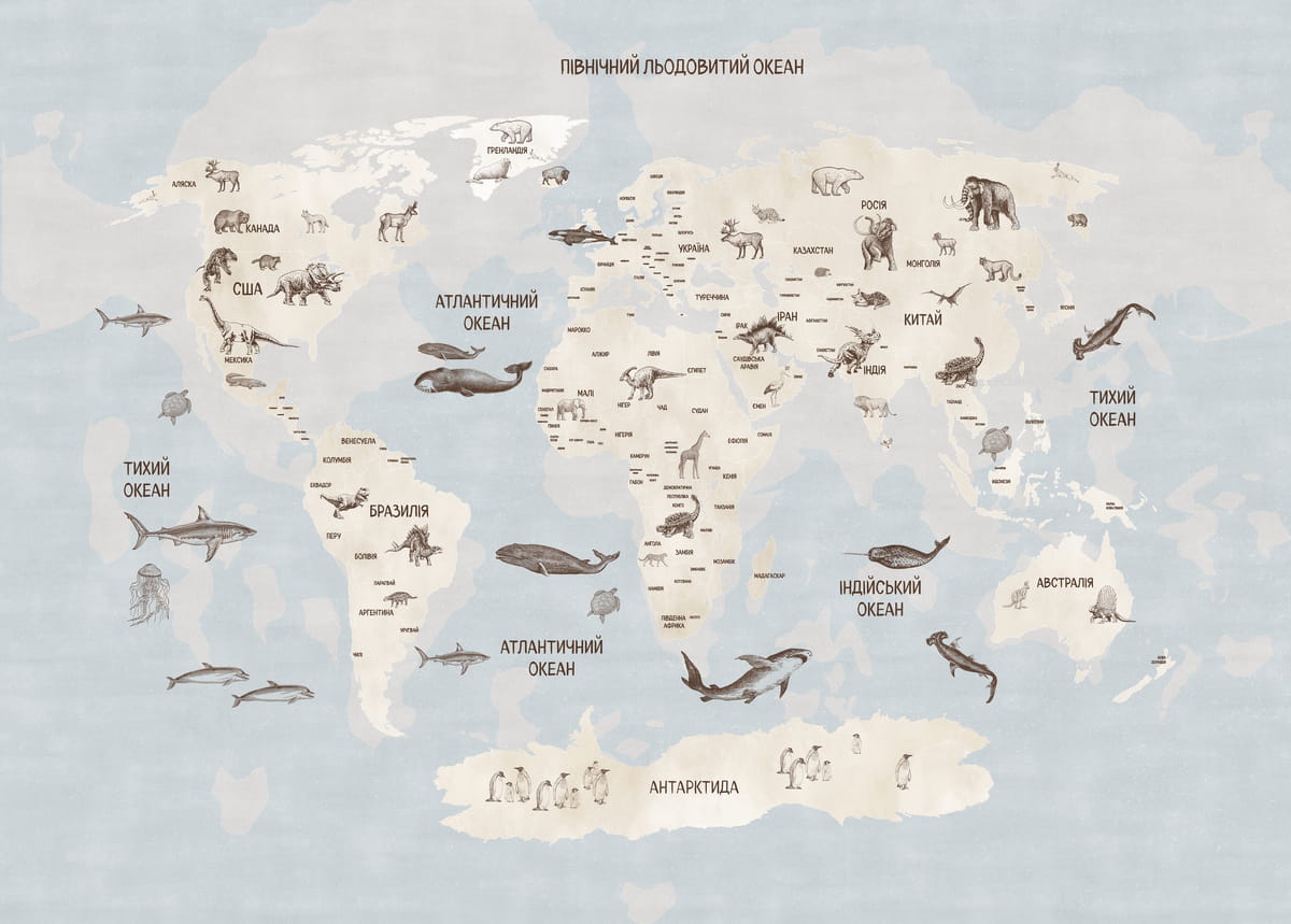 Фотообои Карта мира с животными, укр ( 26408 )Стоимость зависит от размеров