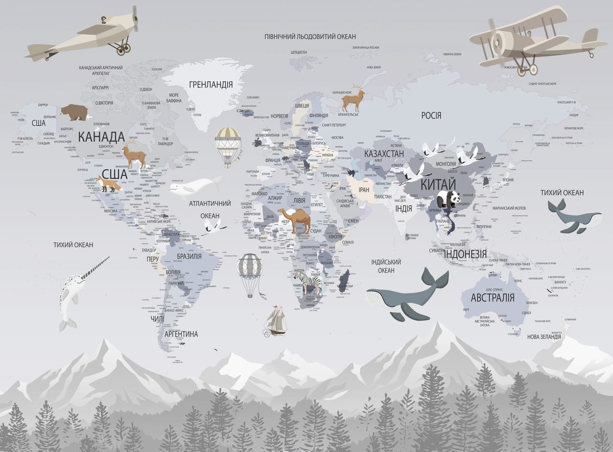 Фотообои Карта мира с животными, укр ( 26408 )Стоимость зависит от размеров