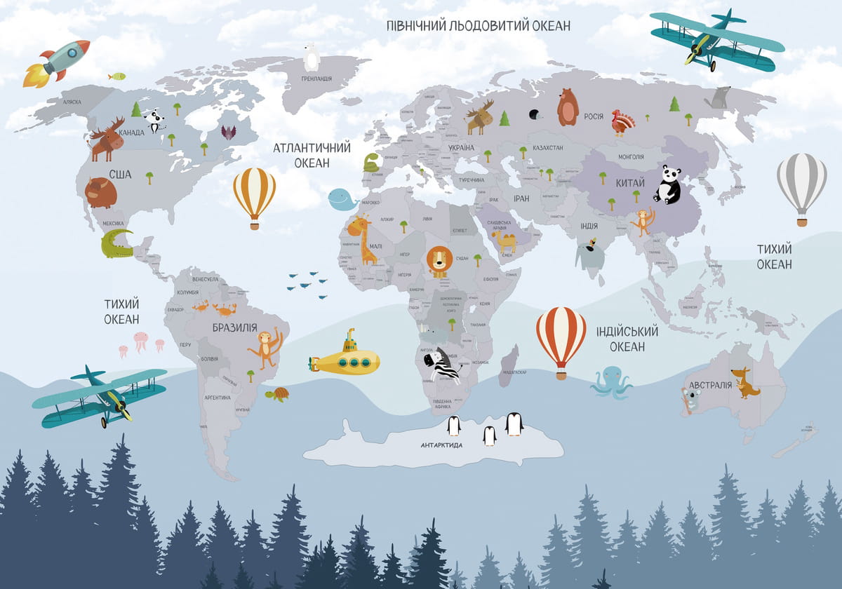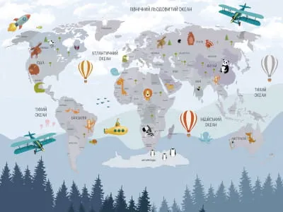 Фотообои Карта мира с животными, укр ( 26408 )Стоимость зависит от размеров