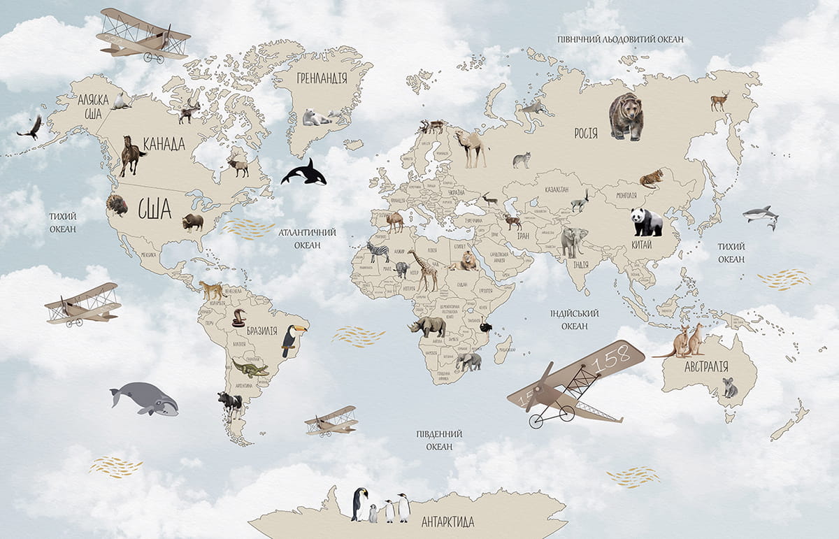 Фотообои Карта мира с животными, укр ( 26408 )Стоимость зависит от размеров
