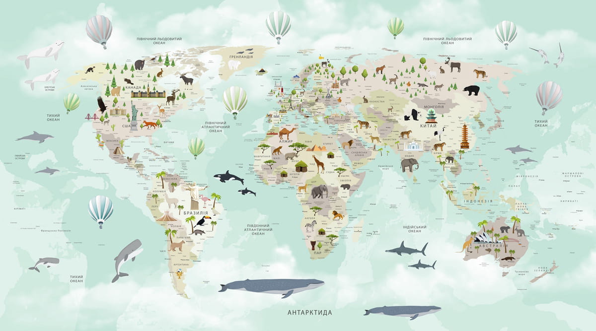 Фотообои Карта мира с животными, укр ( 26408 )Стоимость зависит от размеров