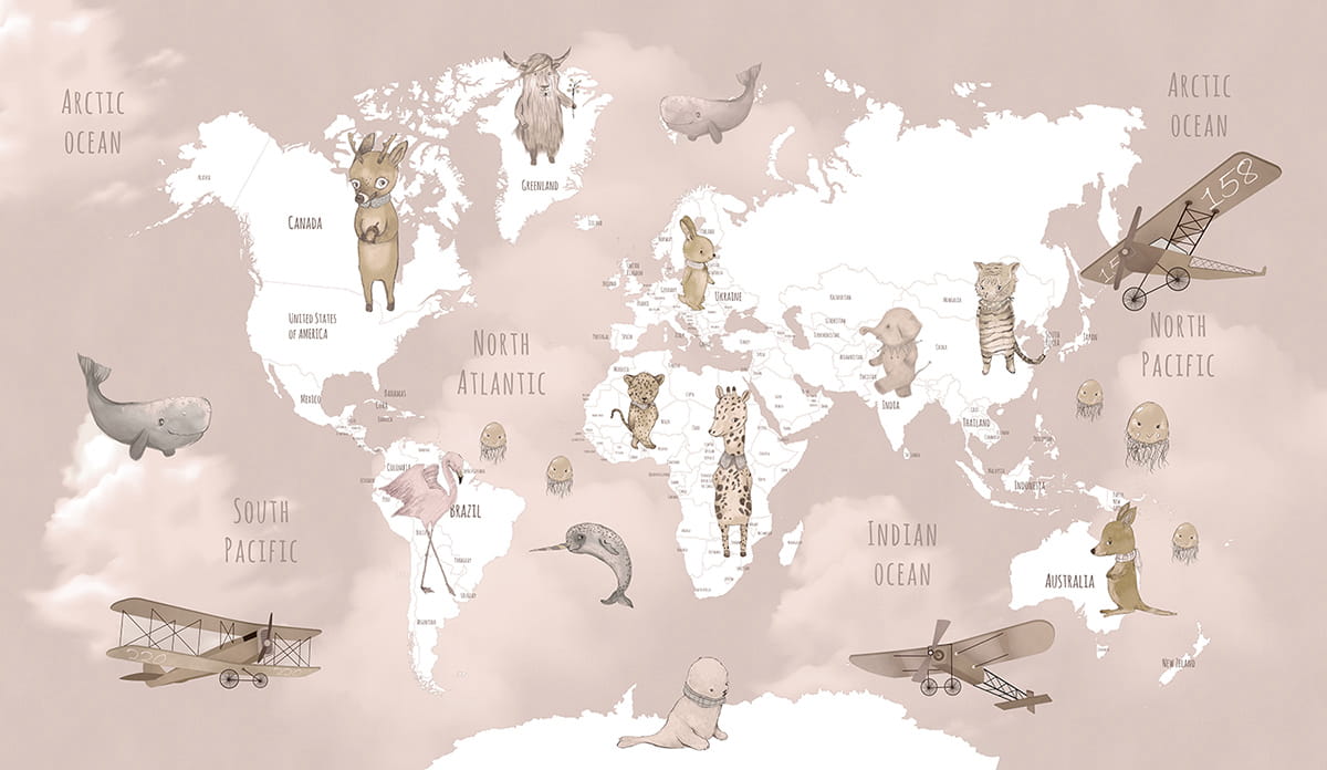 Фотообои Светлая карта мира с животными ( 26570 )Стоимость зависит от размеров