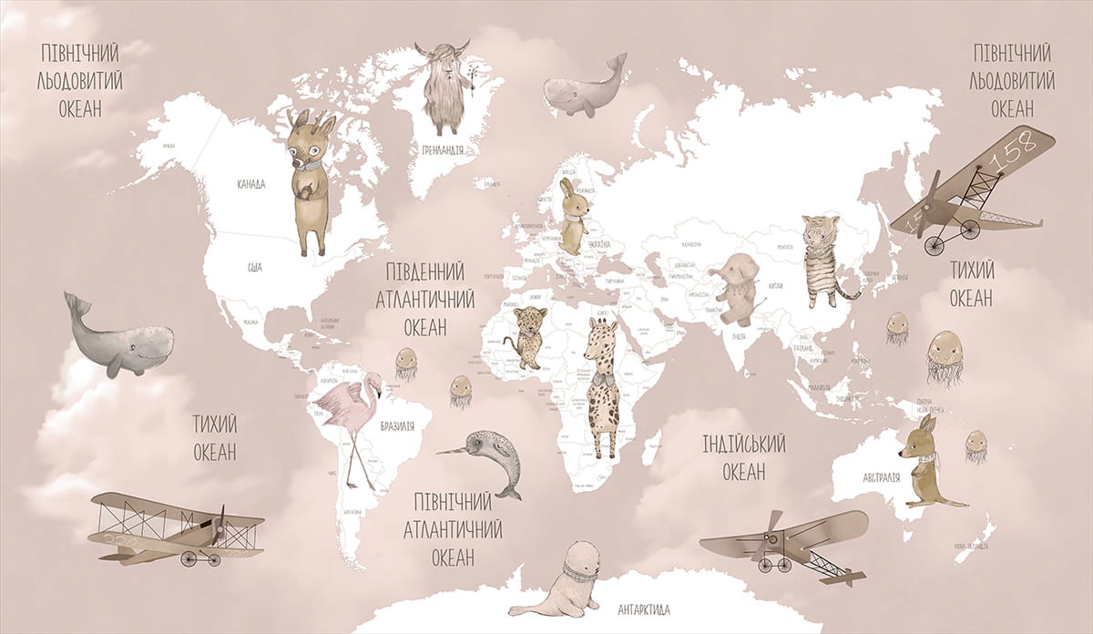 Фотообои Карта мира с животными, укр ( 26408 )Стоимость зависит от размеров